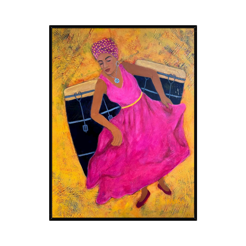 The vibrancy of this piece comes alive through the striking contrast of her brilliant fuchsia dress against the rich gold, blues, and greens of the background, creating a visual symphony that matches the rhythmic beats calling to her spirit.